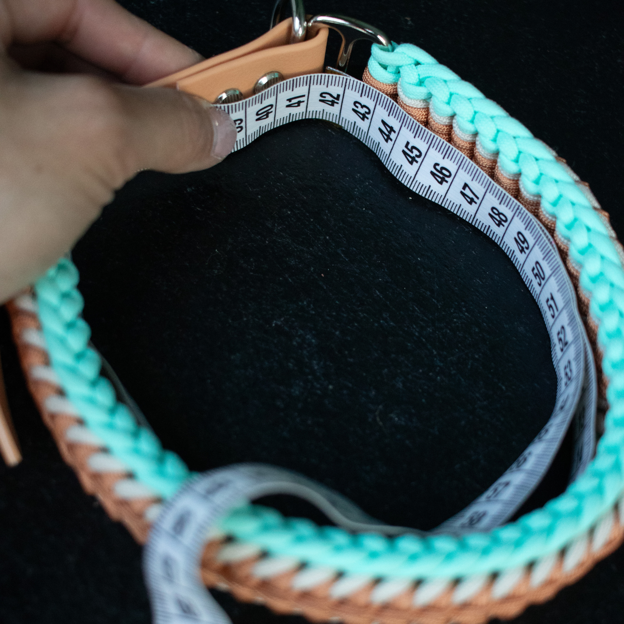 Nimm ein flexibles Maßband, was du in der Mitte des Halses anlegst. Bitte miss eng und plane keinen (!) Puffer mit ein. Damit das Halsband später gut sitzt und nicht zu groß oder zu klein ist, musst du bitte genau messen.
